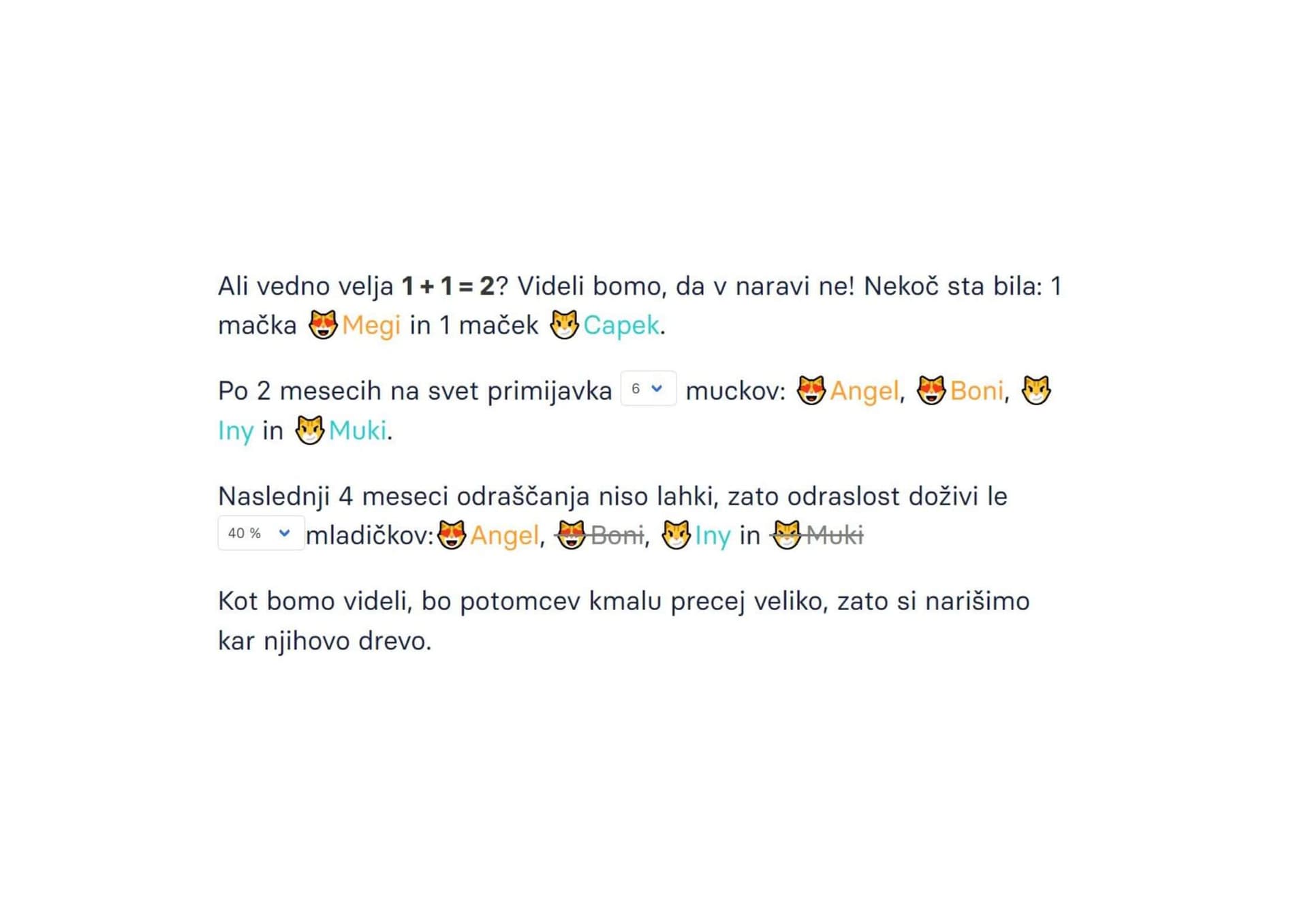 Vesela sem, ko posvojitelji dajo priložnost tudi plašnim mačkom. Rada delam s plašnimi mački in najbolj sem vesela, ko se mali tigri spremenijo v crkljivčke.