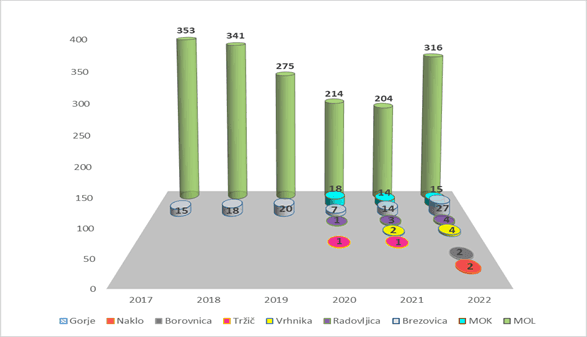 Delež psov sprejetih iz občin Naklo, Borovnica, Tržič, Radovljica, Brezovica, Vrhnika, Gorje, MOK, Postojna, Loška dolina, Cerknica, Bloke glede na MOL od 2011 do 2022